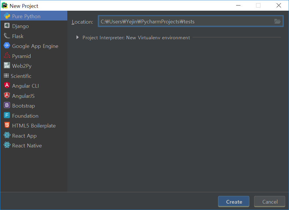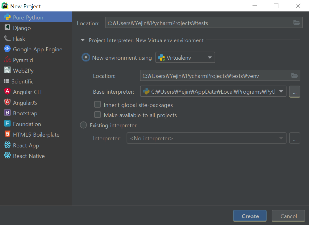 여기까지가 일단 파이참 설치이다. 그런데 interpreter가 계속 다른 3.6 버전이 아닌, 파이썬 버전으로 설정되는 사람들은 아래 글을 더 읽어야 한다.