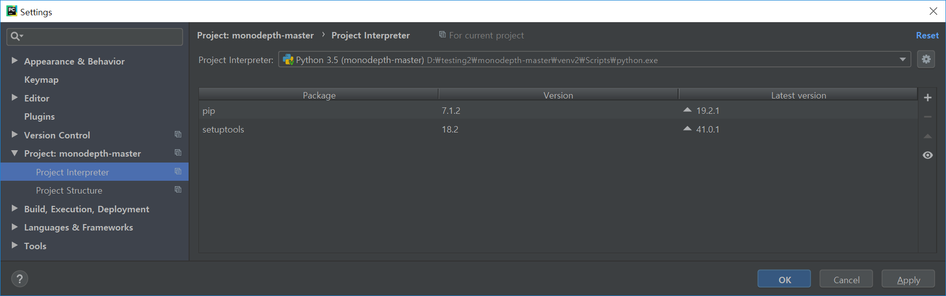 결론만 내자면 Settings에서 interpreter를 찾은 다음에 add를 이용해서 기존 파이썬 말고 다른 파이썬 버전으로 경로 이동을 하는 중이다.