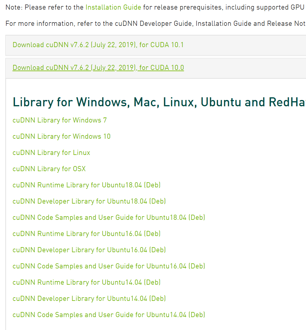 체크를 하게 되면, cuda 10(내가 깐 버전)에 대한 cudnn에 대해서 다운로드를 받을 수 있는 링크들이 뜬다.