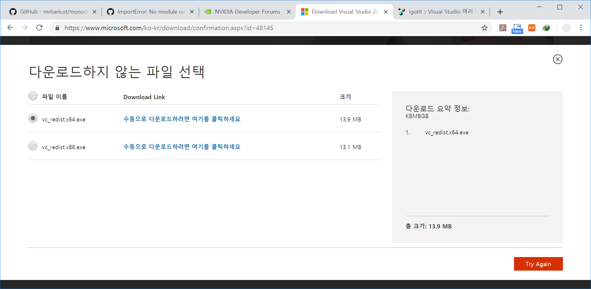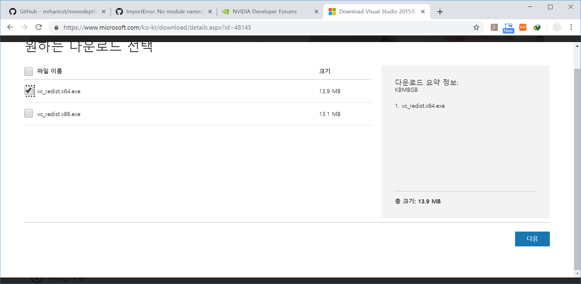 나의 경우, 64비트 짜리로 해주면 되는데, 일단은 64만 깔아보고, 에러가 나면 32비트 프로그램도 돌아가야 하는거니까 32비트도 깔고 확인해보도록 하겠다.