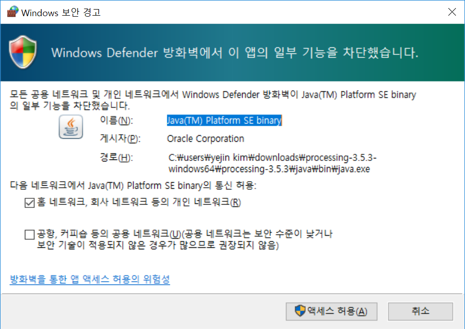 이런 창이 뜨는데 나의 경우 그냥 이 상태에서 액세스 허용을 눌러주었다.