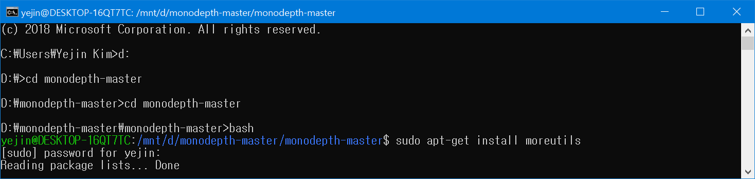 이거는 리눅스 기반 명령어기 때문에 먼저 cmd에서 다음과 같은 활동을 해주어야 한다.