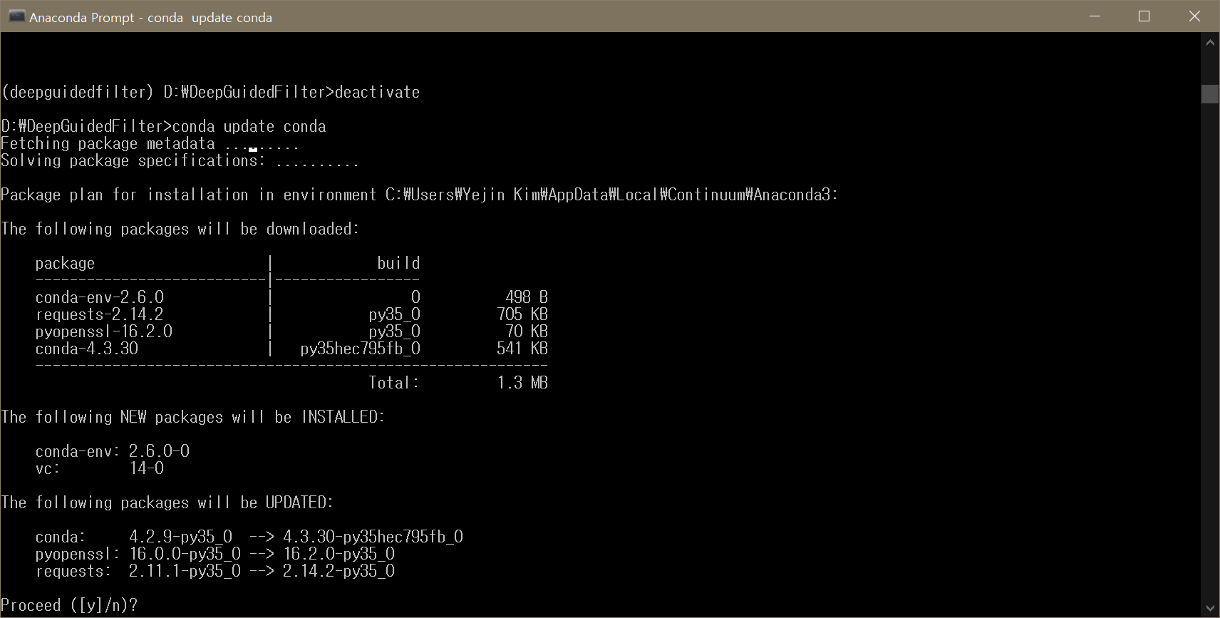 deactivate로 가상환경을 빠져나오고, conda update를 해주었다.