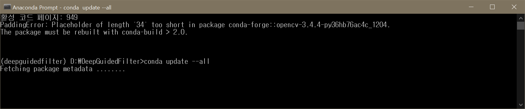 그리고 conda install opencv=3.4 하면 된다.