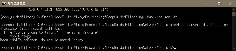 결과는 이렇게 rawpy라는 모듈이 없다는 결과가 나왔는데, 모듈을 다운받아보겠습니다.
