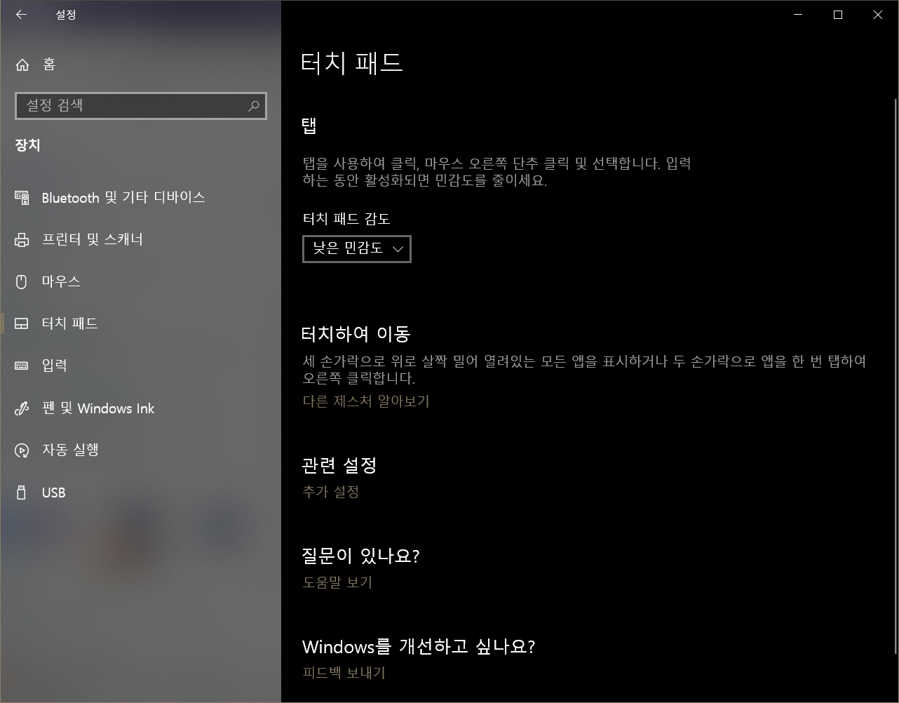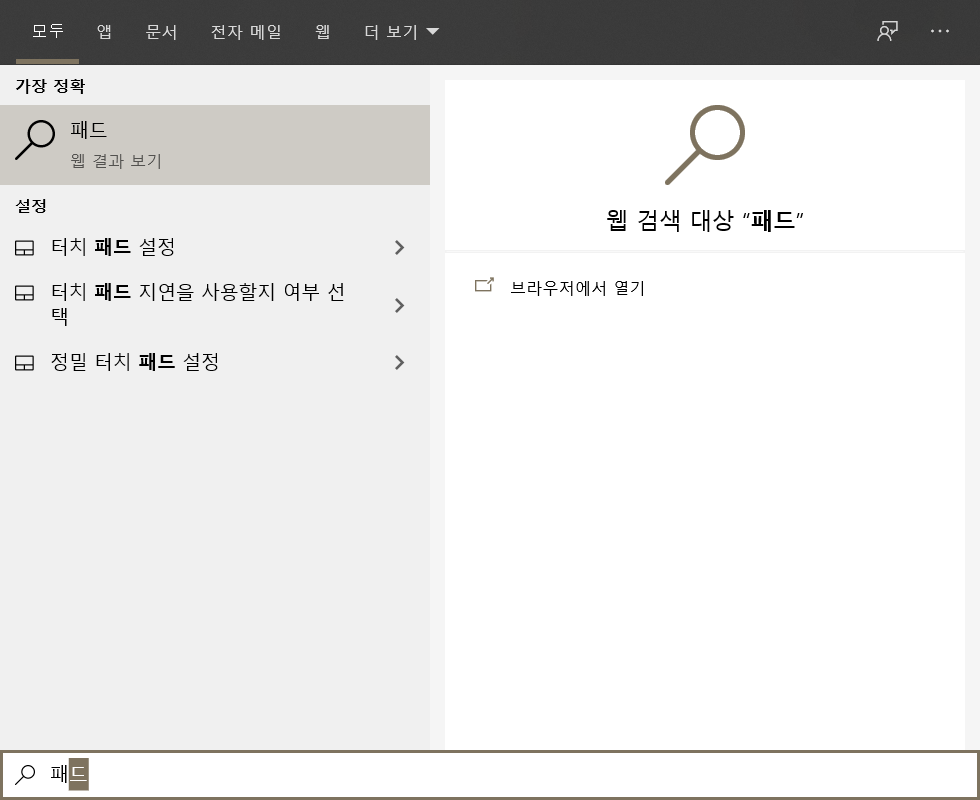 자 이렇게 윈도우에 패드라는 것을 검색하면 터치패드 설정이라는 것이 뜬다.