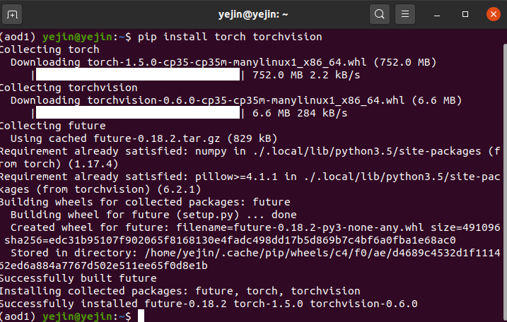 그리고 그 가상환경 안에서 pip 업글이랑 pytorch를 깔아주어야겠습니다.