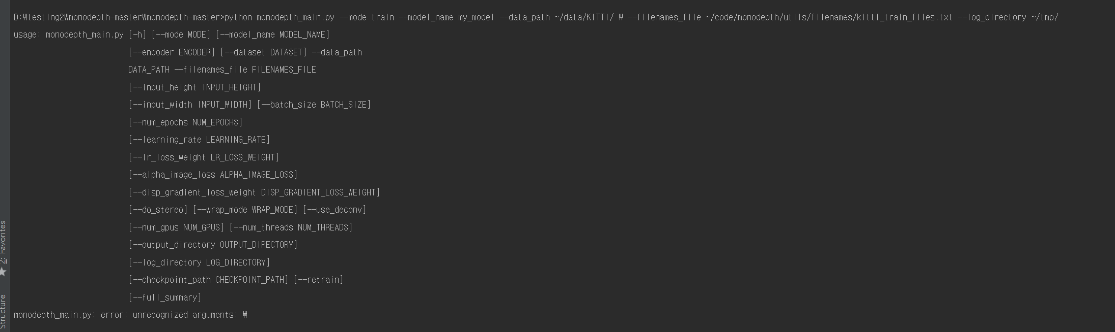 python monodepth_main.py --mode train --model_name my_model --data_path ~/data/KITTI/ \ --filenames_file ~/code/monodepth/utils/filenames/kitti_train_files.txt --log_directory ~/tmp/